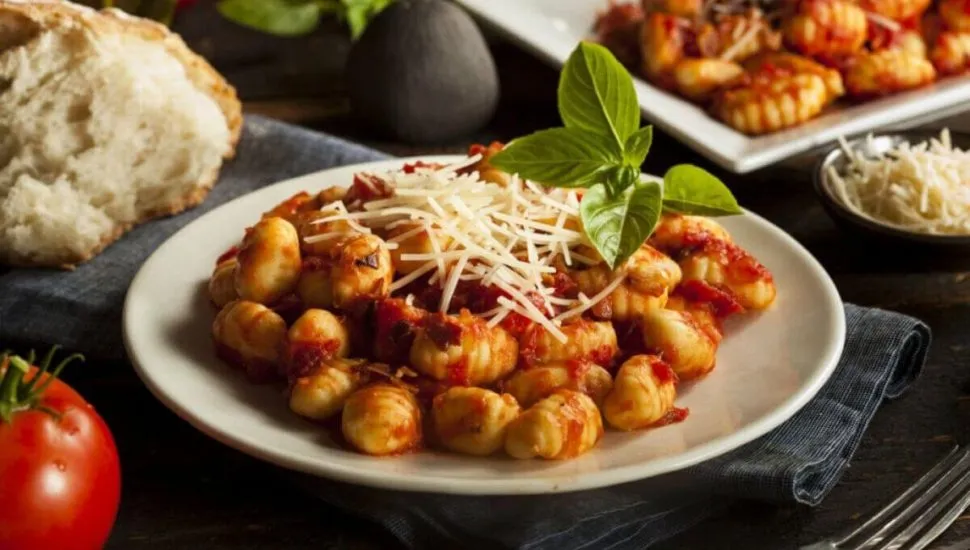 Em uma panela, coloque o azeite e leve ao fogo médio para aquecer. Adicione a cebola e doure. Acrescente o tomate e misture. Tempere com sal e pimenta-do-reino e cozinhe por 35 minutos. Junte a salsa e mexa. Desligue o fogo e despeje o molho sobre o nhoque. Polvilhe com o queijo parmesão e sirva em seguida.