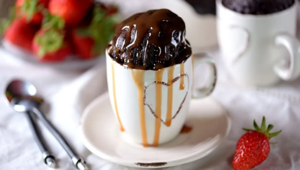 Em um recipiente, misture a farinha de aveia, a clara de ovo e o leite. Acrescente o cacau em pó e continue misturando até ficar homogêneo. Adicione o fermento químico e mexa delicadamente. Coloque a massa em uma caneca que possa ir ao micro-ondas e asse por 1 minuto. Reserve.