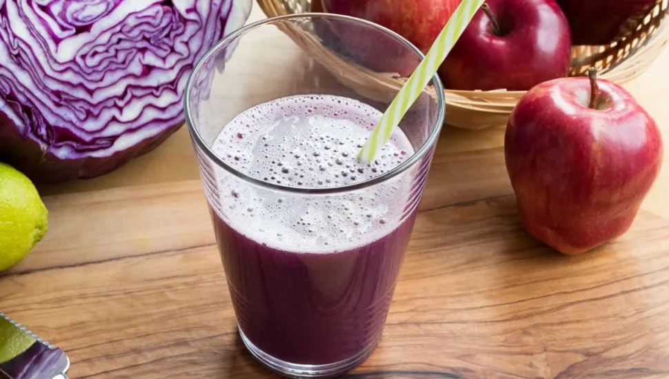 Em um liquidificador, coloque o repolho roxo, a maçã e a água e bata até obter um suco homogêneo. Acrescente o suco de limão e o gelo e bata novamente para misturar. Coe a bebida e sirva em seguida.
