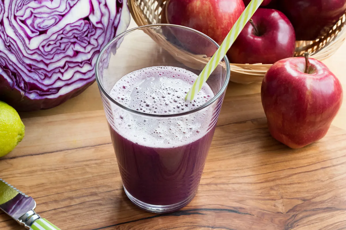 Em um liquidificador, coloque o repolho roxo, a maçã e a água e bata até obter um suco homogêneo. Acrescente o suco de limão e o gelo e bata novamente para misturar. Coe a bebida e sirva em seguida.