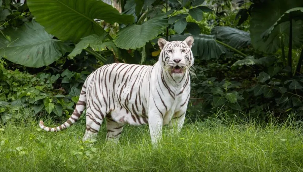 O tigre-de-bengala branco é uma variação rara do tigre-de-bengala, encontrada principalmente na Índia. Sua coloração branca não é resultado do albinismo, mas de uma mutação genética que reduz a produção de pigmentação alaranjada. O corpo exibe listras pretas bem definidas, e os olhos são de um azul profundo, criando uma aparência majestosa.
