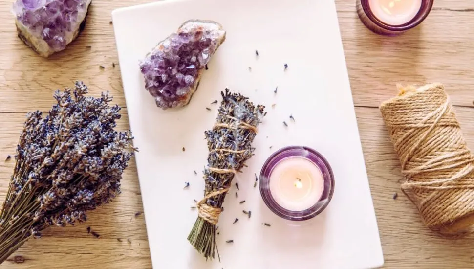 Incenso de sálvia ao lado de cristais roxos e rosas