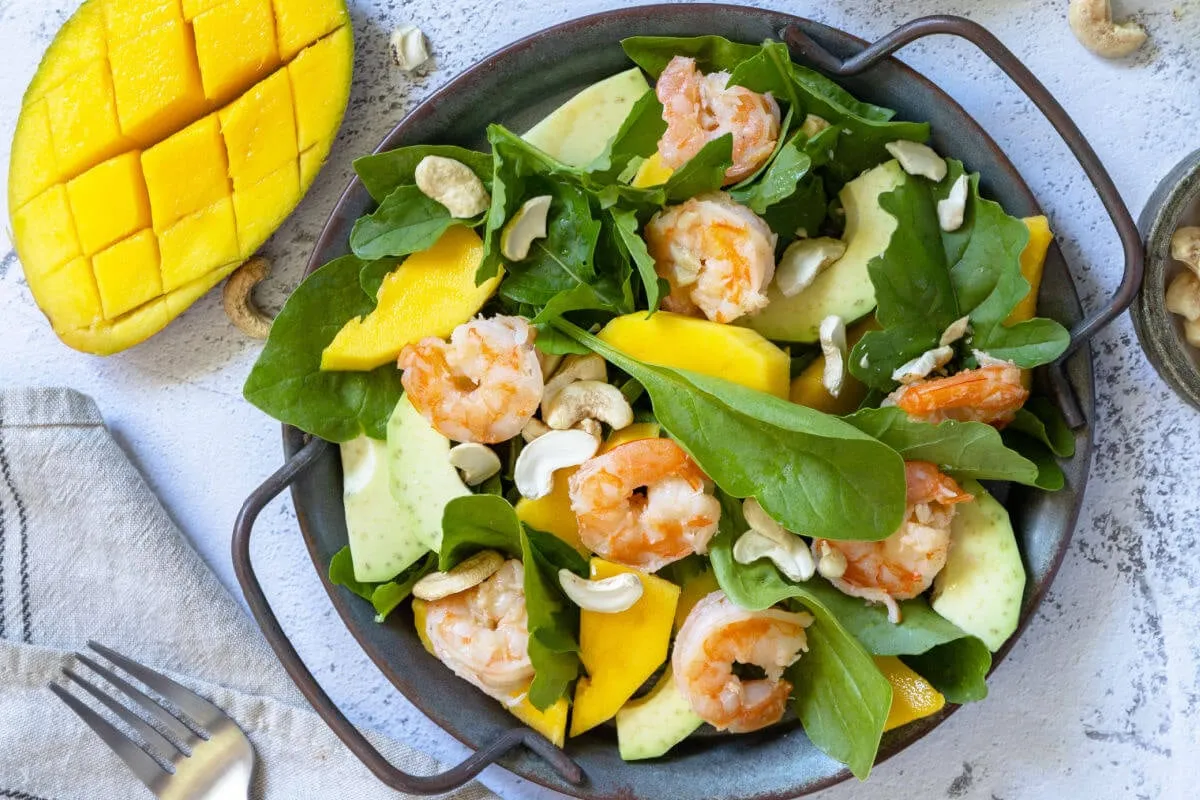 Em uma frigideira, aqueça 2 colheres de sopa de azeite em fogo médio e adicione o camarão. Tempere com sal e pimenta-do-reino. Tampe a frigideira e deixe cozinhar por 10 minutos. Depois, retire a tampa da frigideira e deixe o camarão fritar até atingir uma cor levemente dourada. Reserve. Em uma saladeira, misture as folhas de rúcula e de espinafre com o camarão, a manga, o abacate e a castanha-do-pará. Em um recipiente, misture o iogurte, 1 colher de sopa de azeite, o suco de limão, o sal e a pimenta-do-reino. Sirva o molho sobre a salada.