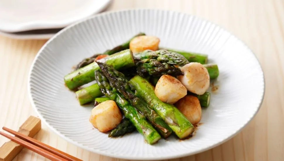 Em uma frigideira, coloque o azeite e a manteiga e leve ao fogo médio para aquecer. Em seguida, adicione o aspargo e deixe fritar por 5 minutos, mexendo ocasionalmente. Tempere com sal e pimenta-do-reino. Em outra frigideira, aqueça o azeite em fogo médio e doure a vieira dos dois lados. Tempere com sal e pimenta-do-reino. Sirva o aspargo com a vieira.