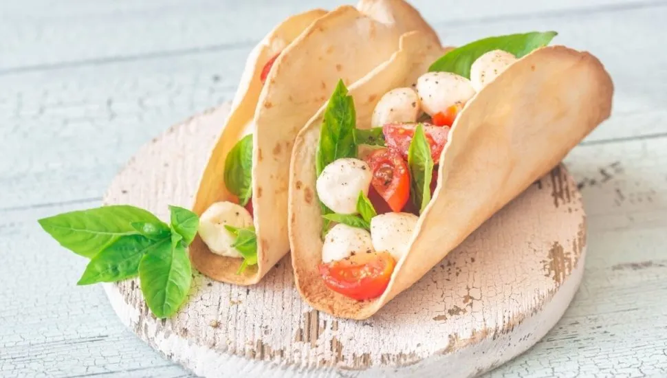 Aqueça uma frigideira em fogo médio. Coloque uma tortilha na frigideira e aqueça por cerca de 1 minuto de cada lado, até que comece a dourar levemente e fique mais firme. Coloque a tortilha aquecida sobre uma superfície plana. Distribua as bolinhas de muçarela de búfala e os tomates-cereja. Regue com azeite de oliva. Tempere com sal e pimenta-do-reino moída. Em seguida, adicione as folhas de manjericão por cima dos ingredientes. Dobre a tortilha, pressionando levemente para que os ingredientes se mantenham no lugar. Sirva imediatamente.
