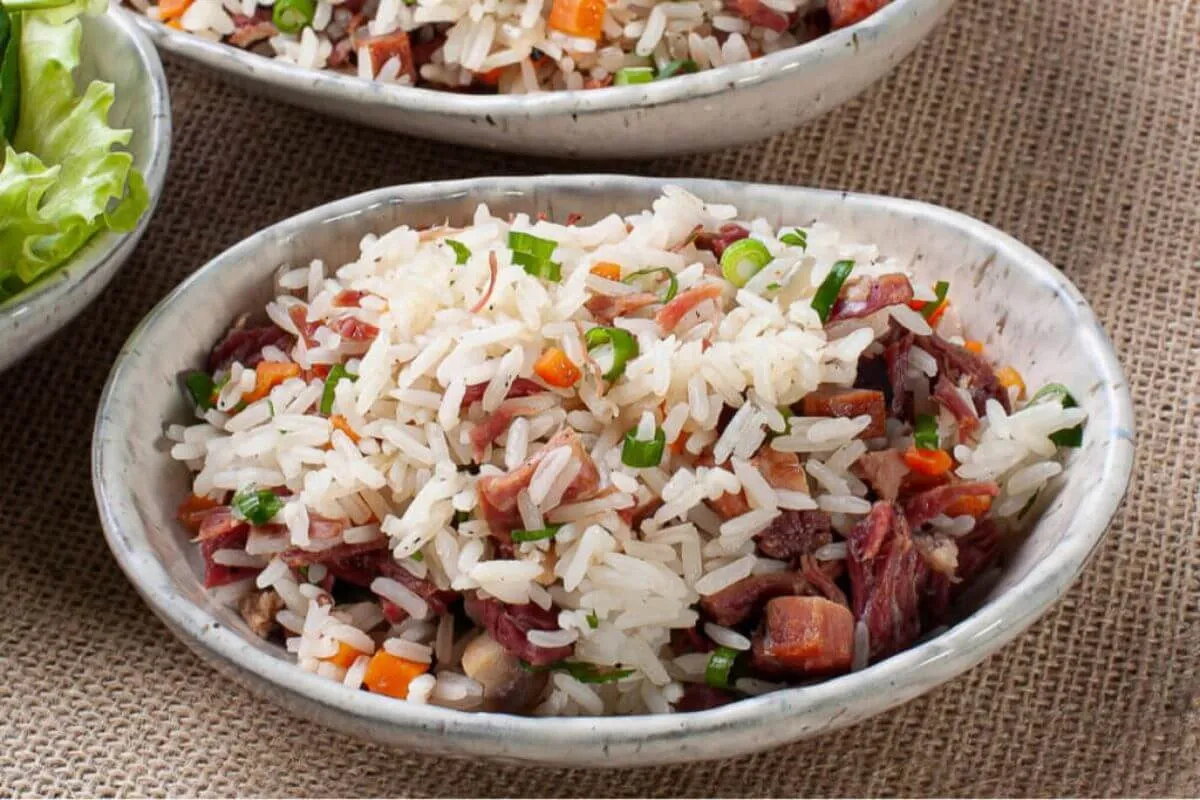 Em uma panela, coloque o bacon e a calabresa e leve ao fogo médio para fritar até dourar. Adicione a cebola e o alho e refogue até a cebola murchar. Acrescente o pimentão e a cenoura e refogue por mais 5 minutos. Junte a carne-seca e o arroz e misture. Tempere com sal, cubra com água e tampe a panela. Cozinhe até secar a água. Desligue o fogo, salpique com cebolinha e sirva em seguida.