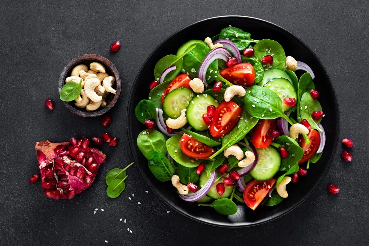 Em uma saladeira, coloque as folhas de espinafre, o pepino, o tomate, a cebola-roxa e as sementes de romã. Tempere com suco de limão, azeite de oliva, sal e pimenta-do-reino. Acrescente o gergelim e as castanhas-de-caju e misture. Sirva em seguida.