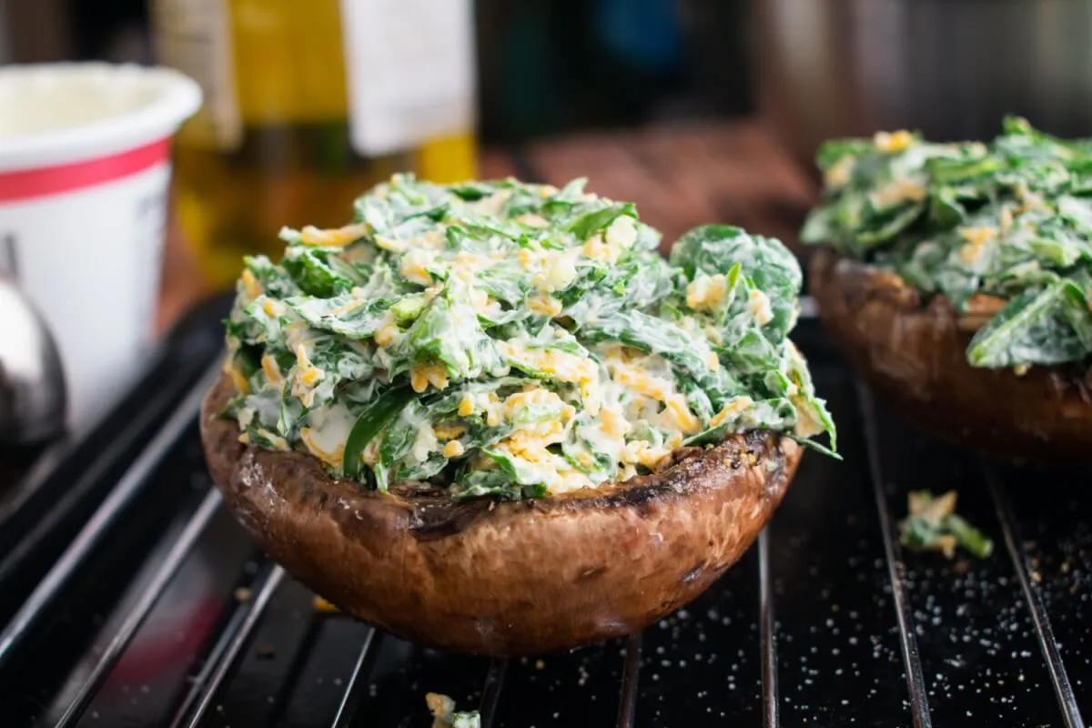 Em uma assadeira, coloque os cogumelos e regue com azeite de oliva. Tempere com sal e pimenta-do-reino e leve ao forno preaquecido a 180 °C por 10 minutos. Retire do forno e reserve. Em uma frigideira, coloque o azeite de oliva e leve ao fogo médio para aquecer. Adicione o alho e doure. Acrescente as folhas de espinafre e a cenoura e refogue até murchar. Junte o suco de limão e o creme de castanha-de-caju e misture. Recheie os cogumelos com a mistura e sirva em seguida.