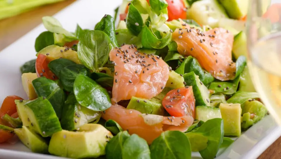 Em um recipiente, coloque a rúcula, o abacate, o pepino, os tomates-cereja e o salmão e misture delicadamente. Junte as sementes de chia e mexa para incorporar. Tempere com suco de limão e sal. Sirva em seguida.