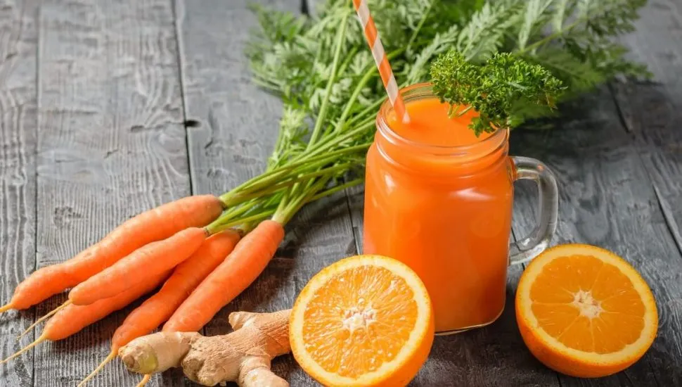 No liquidificador, coloque o suco de laranja, a cenoura e o gengibre e bata até obter uma mistura homogênea. Adicione a cúrcuma e as pedras de gelo e bata até incorporar. Sirva em seguida.