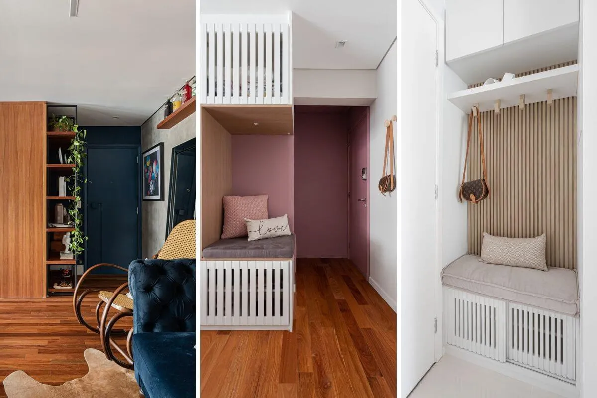 E para aqueles que buscam otimizar o espaço, a chapelaria planejada de Natalia Salla serve como uma divisória inteligente entre a cozinha e a sala de estar, criando um efeito de hall de entrada ideal que é tanto prático quanto charmoso.