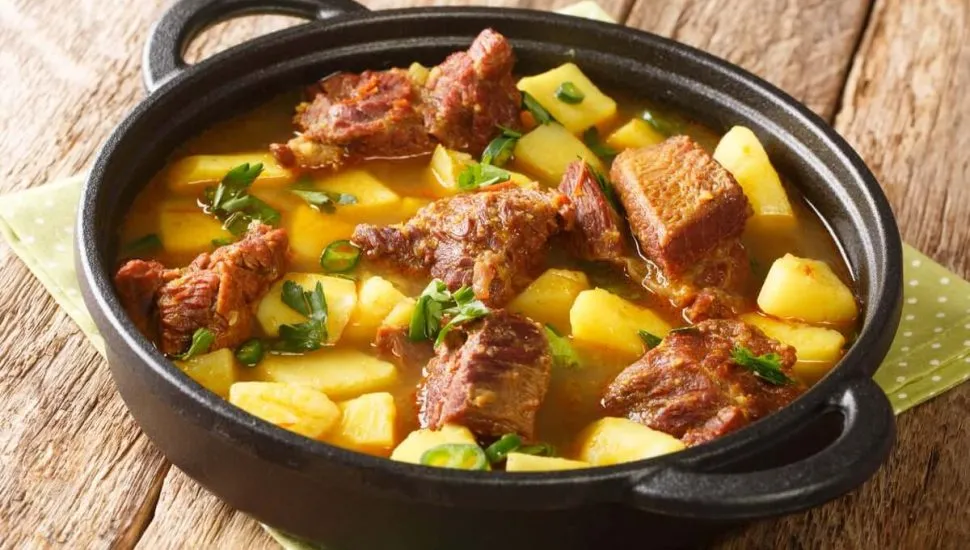 Na panela de pressão, coloque o óleo de milho e leve ao fogo médio para aquecer. Adicione a cebola e doure. Acrescente os pedaços de carne e refogue por 15 minutos. Junte o caldo de carne e o colorau. Cubra com água, tampe a panela e cozinhe por 25 minutos após iniciar a pressão. Em seguida, retire do fogo, aguarde a pressão sair e junte as batatas e o cheiro-verde. Leve ao fogo médio novamente e deixe cozinhar na pressão por 5 minutos. Desligue o fogo e aguarde a pressão sair. Sirva em seguida.