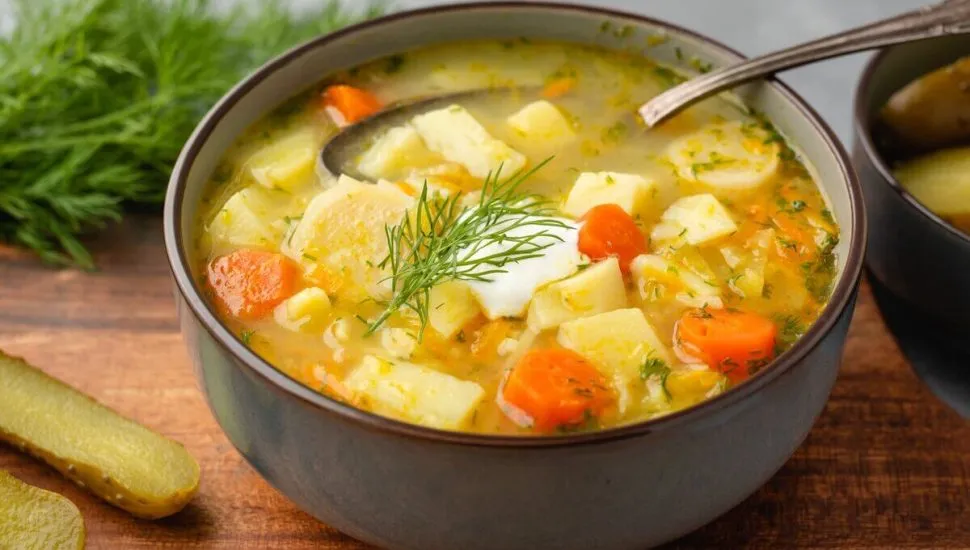 Em uma panela, coloque o azeite e leve ao fogo médio para aquecer. Adicione a cebola e o alho e doure. Acrescente as batatas, as cenouras, os pepinos e refogue por 5 minutos. Junte o caldo de legumes e tempere com sal e pimenta-do-reino. Cozinhe até os legumes ficarem macios. Desligue o fogo e sirva em seguida com endro.