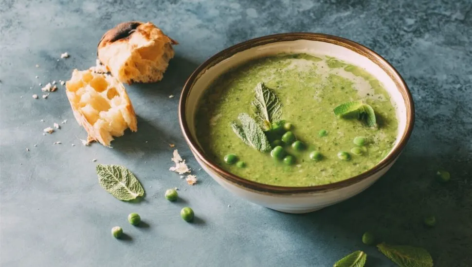 Em uma panela, coloque a ervilha e o caldo de legumes e leve ao fogo médio para cozinhar até levantar fervura. Após, adicione as folhas de hortelã, tempere com sal e pimenta-do-reino. Deixe cozinhar por mais 10 minutos, desligue o fogo e sirva em seguida.