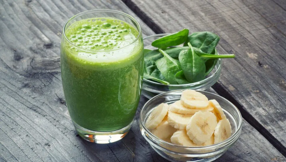 Em um liquidificador, coloque as folhas de espinafre, a banana, a água e bata até obter uma consistência homogênea. Transfira o suco para um copo, adicione as pedras de gelo e sirva em seguida.