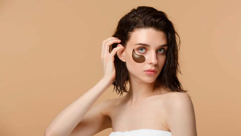 Mulher segurando a cabeça com as duas mãos e com máscara de tratamento abaixo dos olhos
