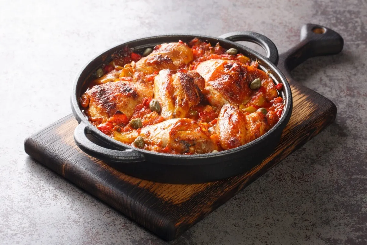 Em um recipiente, tempere o frango com sal, pimenta-do-reino, alho e páprica. Deixe descansar por pelo menos 20 minutos para pegar sabor. Em uma panela grande, aqueça o azeite em fogo médio e doure levemente os pedaços de frango de todos os lados. Retire e reserve. Na mesma panela, refogue a cebola até ficar macia. Acrescente os pimentões e refogue por mais alguns minutos. Adicione os tomates e misture bem, deixando formar um molho natural. Volte o frango para a panela, acrescente a água e a alcaparra. Tampe e cozinhe em fogo baixo por cerca de 25 a 30 minutos, até o frango ficar macio e bem cozido. Sirva em seguida.