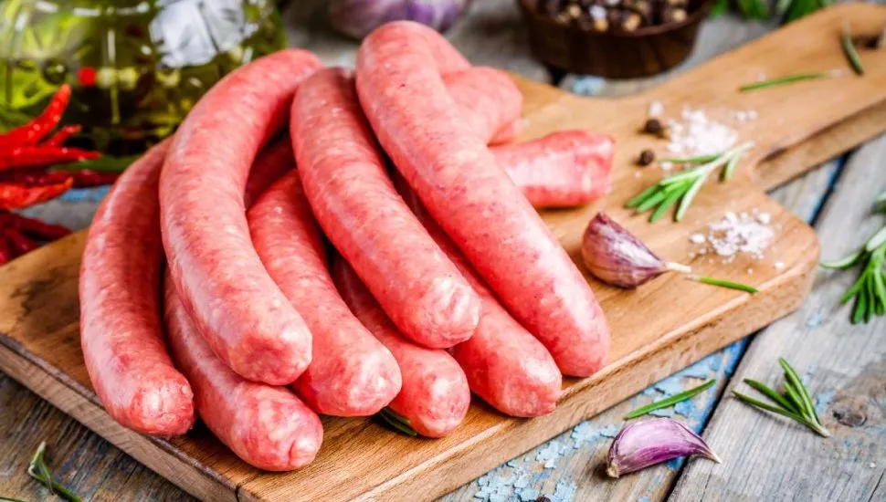 Imagem mostra uma linguicinha de churras em uma tábua com temperos.