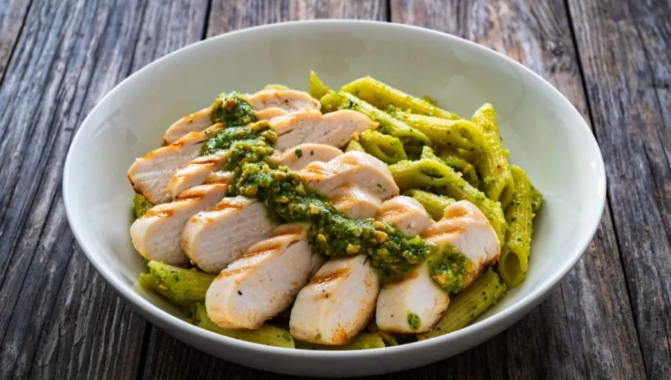 Penne com molho pesto e peito de frango grelhado