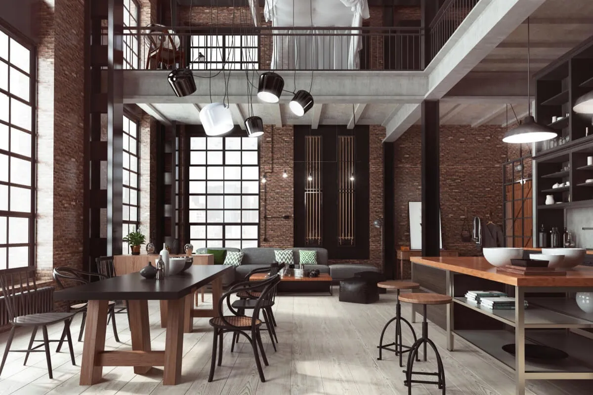 O estilo industrial traz características ousadas e que podem remeter ao passado, como o estilo retrô. Você pode aproveitar com elegância móveis oxidados e antigos, texturas desgastadas e madeiras cruas e envelhecidas. É comum encontrar em ambientes com esse estilo materiais brutos e inacabados, paredes de tijolos expostas, pisos de cimento, portas e janelas largas, encanamentos e vigas expostas, entre outros.