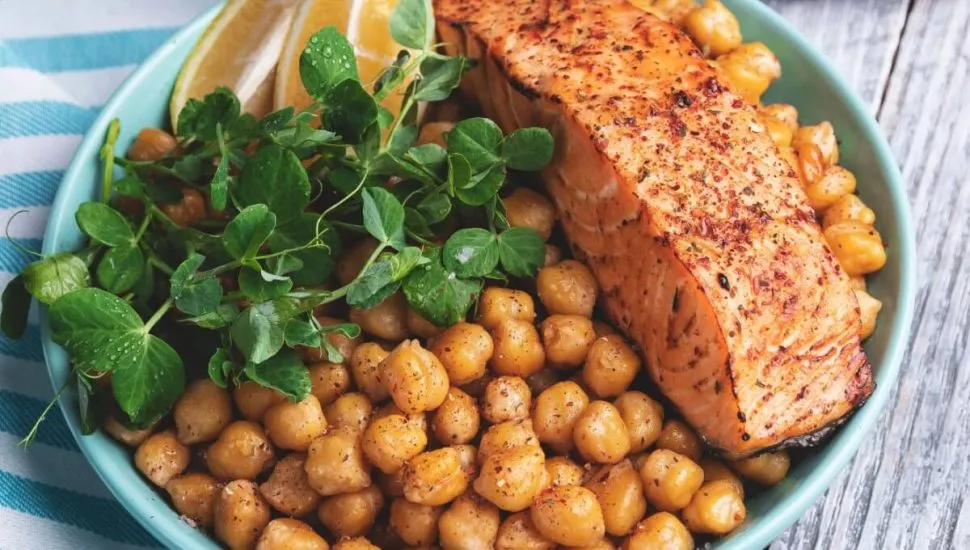 Na mesma frigideira, adicione o grão-de-bico e refogue por 3 a 5 minutos em fogo médio, mexendo sempre. Tempere com sal e pimenta-do-reino. Em uma tigela ou prato fundo, coloque o grão-de-bico, posicione o filé de salmão grelhado por cima e finalize com os brotos de ervilha. Adicione as fatias de limão-siciliano e sirva em seguida.