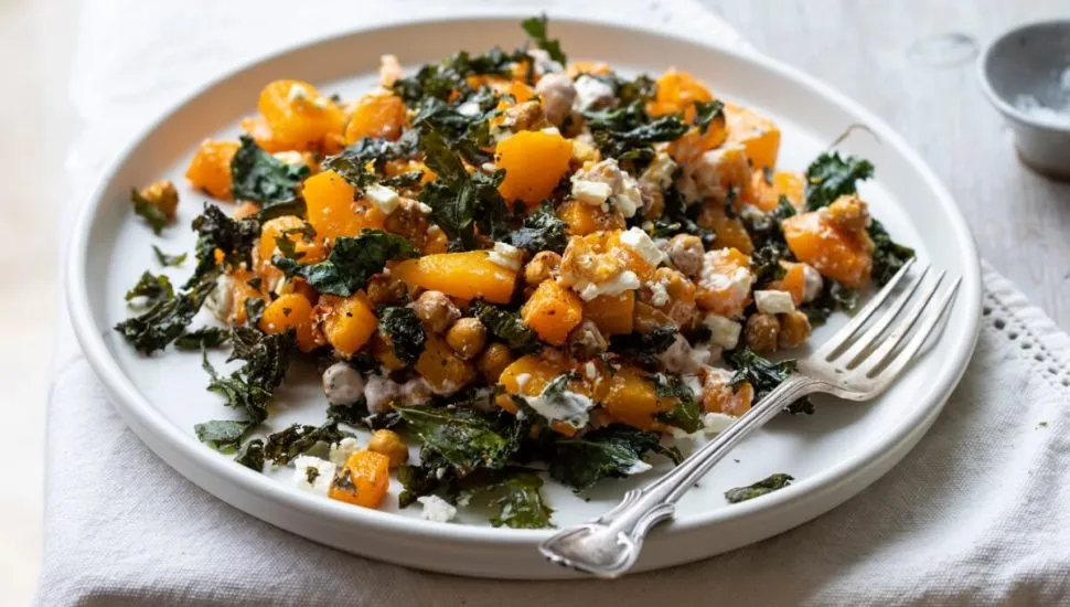 Salada morna de abóbora com couve e grão-de-bico