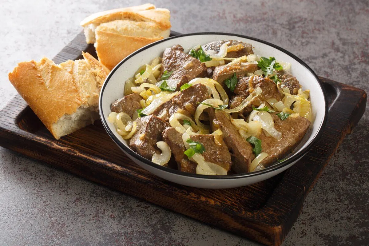 Em um recipiente, tempere o fígado com sal, pimenta-do-reino e alho. Cubra e leve à geladeira por 15 minutos. Em uma panela, coloque o azeite e leve ao fogo médio para aquecer. Retire a carne da geladeira, disponha sobre a panela e refogue até dourar. Acrescente a cebola e doure. Desligue o fogo e sirva em seguida.