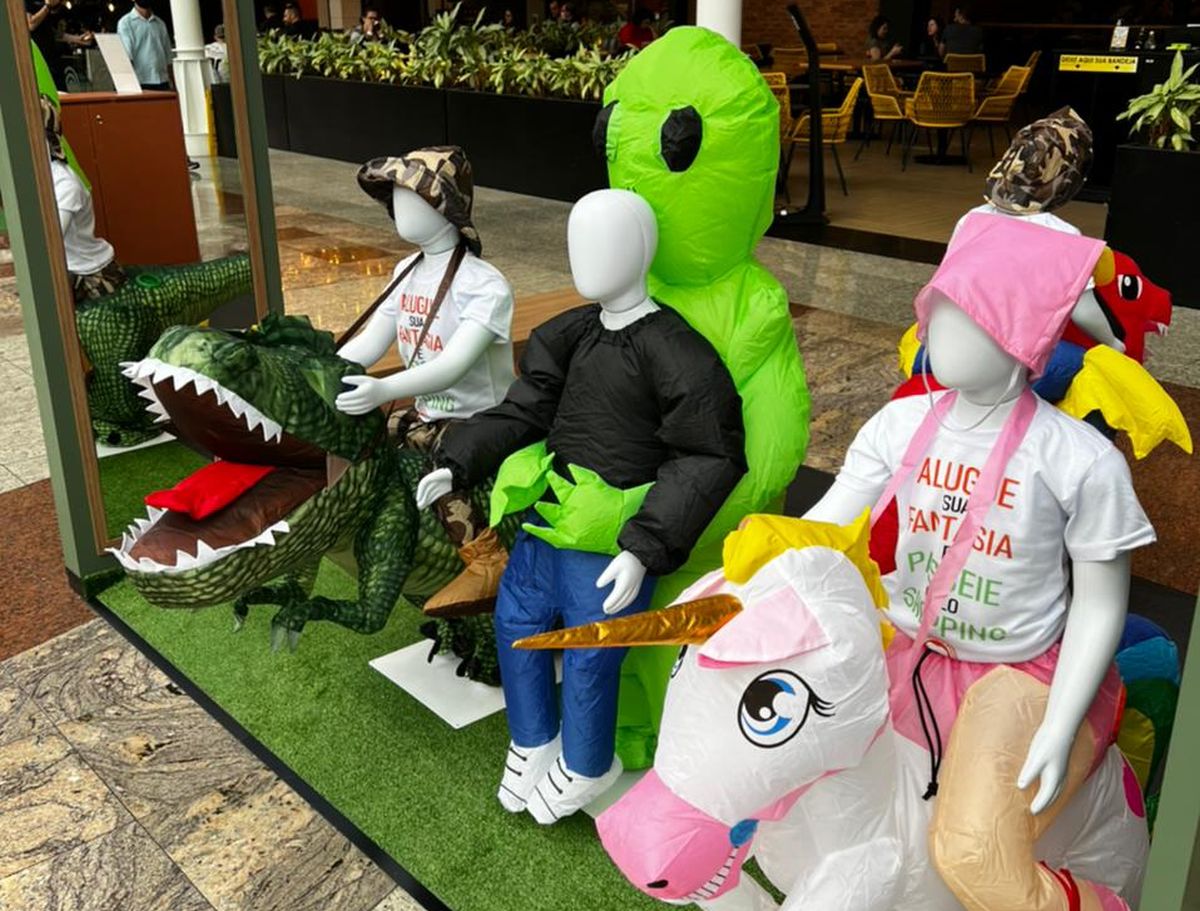 Uma cena está se tornando comum no Shopping Estação: crianças e adultos fantasiados com unicórnios, dinossauros e até ETs. É porque acaba de inaugurar no local um quiosque da Teddy Rex, empresa que aluga fantasias temáticas infláveis.