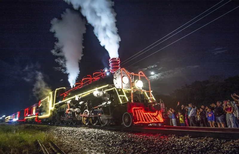 A locomotiva que encanta os curitibanos é uma clássica Mallet 204, fabricada em 1950 e considerada a única a vapor ainda em operação na América do Sul. A Maria Fumaça Iluminada da Rumo é uma das atrações que integra a programação do Natal de Curitiba 2025.