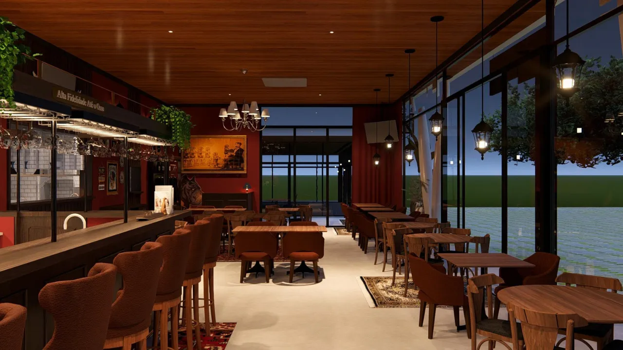 O bar na Pedreira Paulo Leminski está localizado no acesso ao espaço, chamado de Rua da Música. Confira o projeto do interior da nova unidade do bar: