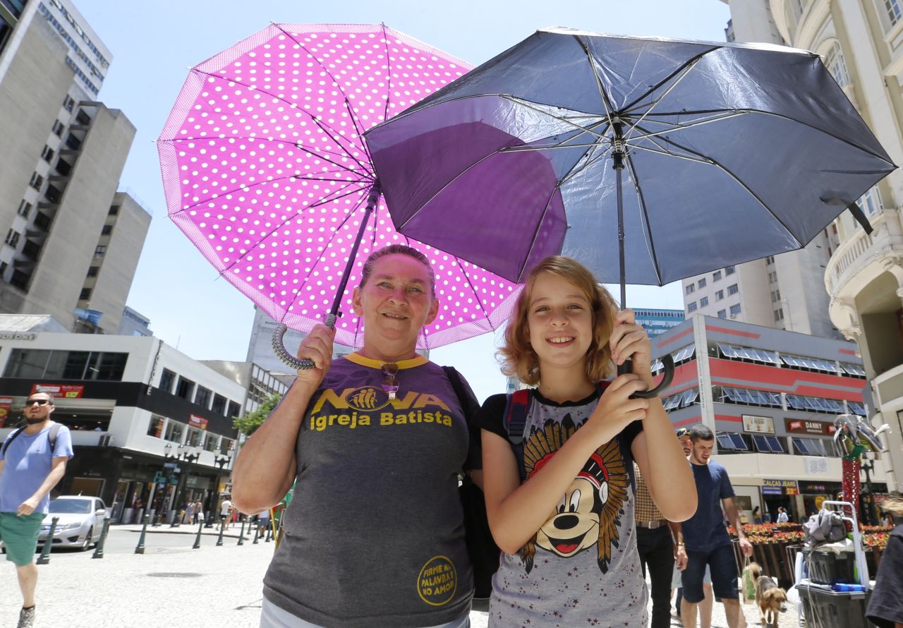 A sombrinha é basicamente utilizado para se proteger da chuva, mas com o sol forte na cabeça, está fácil encontrá-las nas ruas de Curitiba nos últimos dias. A aposentada Neocilda Neiva,de 73 anos, trouxe do Norte do país este costume. “Eu nasci no Pará e desde criança faço isso. Lá é muito comum a proteção com a sombrinha, pois nem sempre tínhamos o protetor solar”, diz a aposentada que estava ao lado da neta Letícia no calçadão da Rua XV.