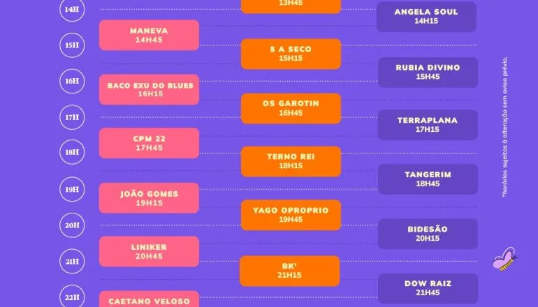 A organização acaba de divulgar os horários dos shows, que acontecerão em três palcos distribuídos entre a Pedreira Paulo Leminski e a Ópera de Arame. O lineup conta com nomes de peso da música brasileira, como Caetano Veloso, Liniker, Matuê, João Gomes, Baco Exu do Blues e CPM 22.
