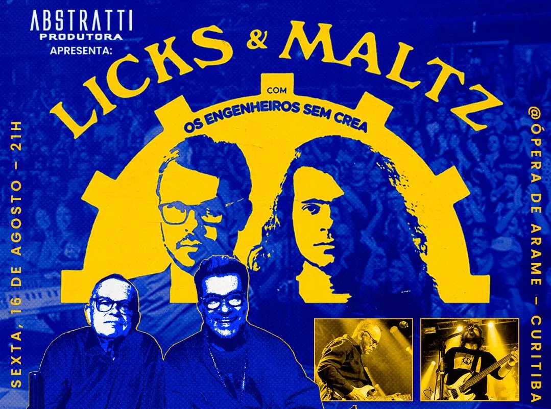 O show Licks & Maltz, com os Engenheiros sem CREA, chega a Curitiba no dia 16 de agosto (sexta-feira), no palco da Ópera de Arame. Revisitando canções de todos os álbuns clássicos do Engenheiros do Hawaii, os ex-integrantes da cultuada formação GLM, Augusto Licks (guitarra, violão e teclado) e Carlos Maltz (bateria) se juntam ao vocalista Sandro Trindade para relembrar os sucessos que marcaram o rock nacional nos anos 1980 e 90.