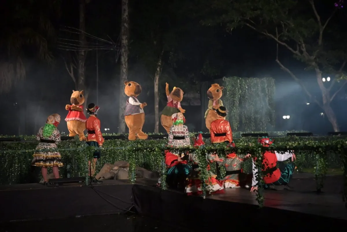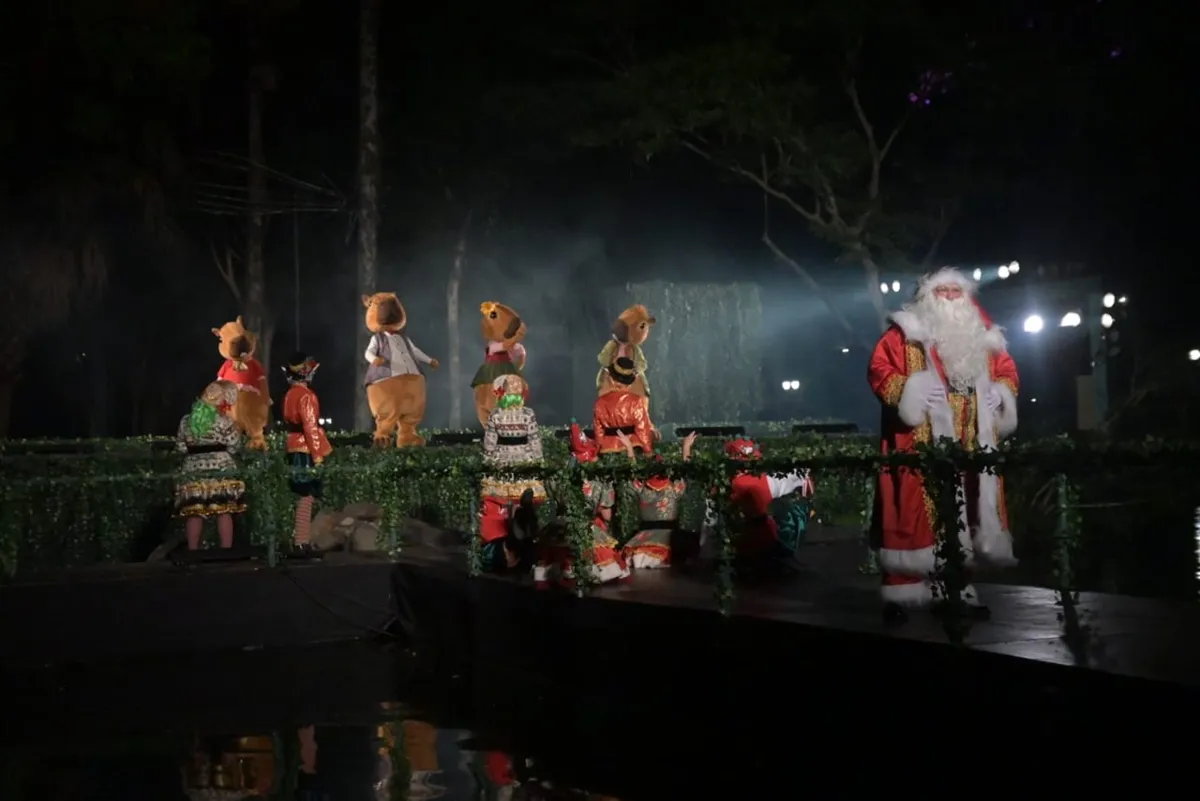 Com início às 19h15, a apresentação acontece em um cenário especial montado ao ar livre na Ilha das Ilusões, localizada no lago principal do Passeio Público. Os visitantes puderam acompanhar a história divertida de uma família de capivaras – composta por mãe, pai, filho e filha – que se prepara para celebrar um Natal inesquecível.