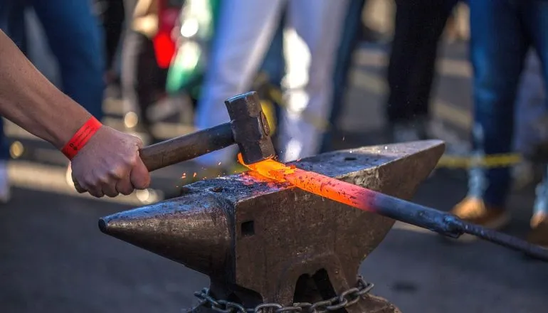 Nestas ocasiões, o aço é colocado dentro de uma fornalha com temperatura a mais de 1000ºC e fica na cor vermelho-brilhante. Depois é modelado utilizando uma marreta e bigorna, até se transformar em uma lâmina.