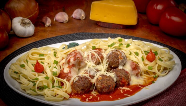Polpetas bovinas à parmegiana (bolinhos de carne) com molho sugo artesanal e queijo muçarela argentino gratinado. Acompanhado de fetuccine na manteiga com cheiro verde.