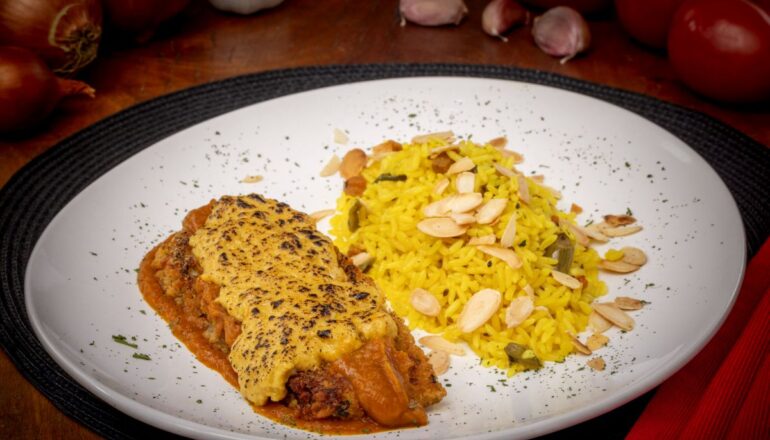 VEGANA – Filé de abobrinha empanada com cobertura de queijo de castanha de caju gratinado. Acompanha curry de abóbora e arroz pilaf aromático com amêndoas.