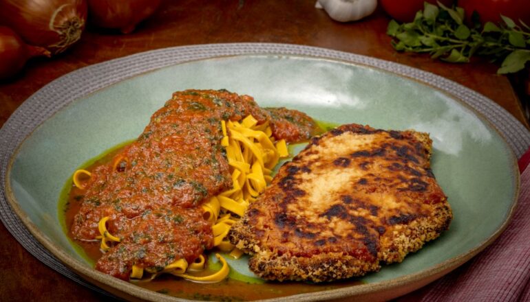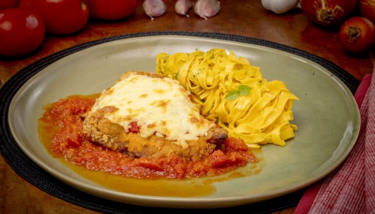 Corte especial de leitão à Parmegiana, acompanha fettuccine artesanal servido na emulsão de ervas e pomodoro.