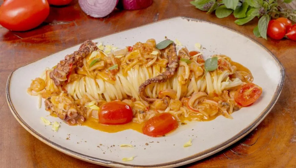 - Linguini artesanal com frutos do mar, molho bisque de camarão e tomatinhos. Valor: 79,00