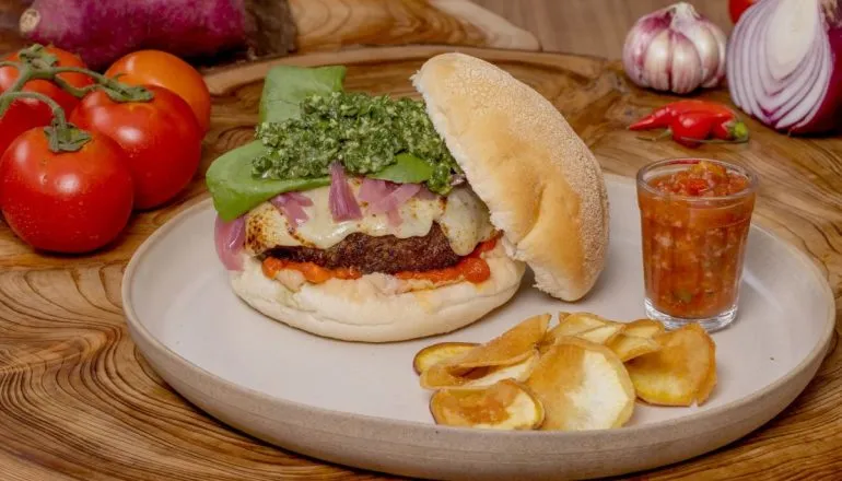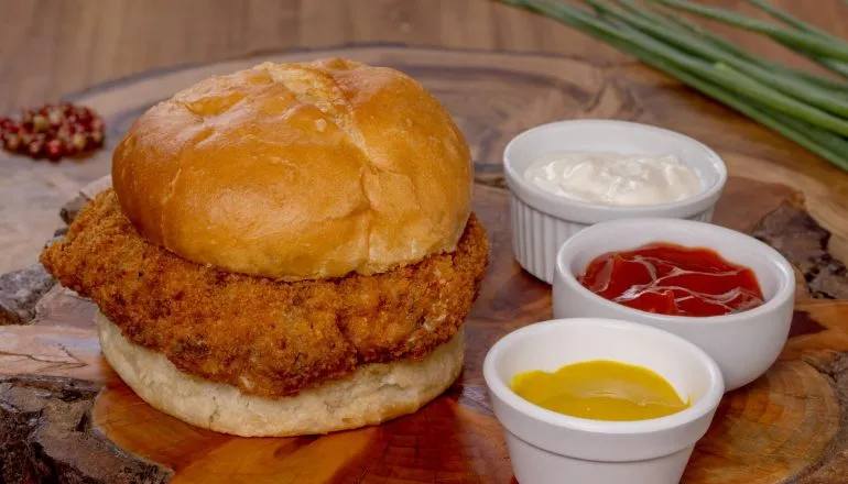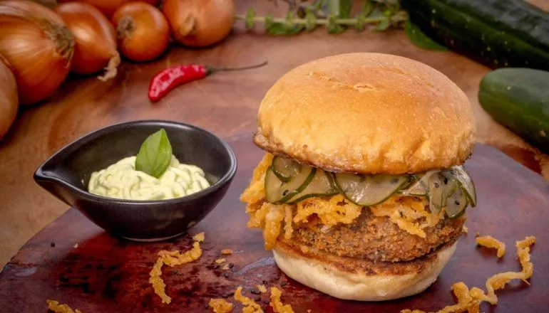 E a turma vegana não fica de fora dessa festa! O festival apresenta um bolinho de grão-de-bico ou proteína de soja com maionese de ervas e queijo cremoso vegetal.
