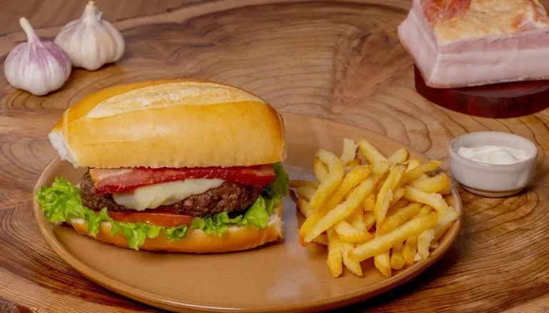 Descrição: Bolinho de carne bovina, bacon, queijo muçarela derretido, alface, tomate, maionese de alho artesanal, servido no pão francês. Acompanha batatas fritas