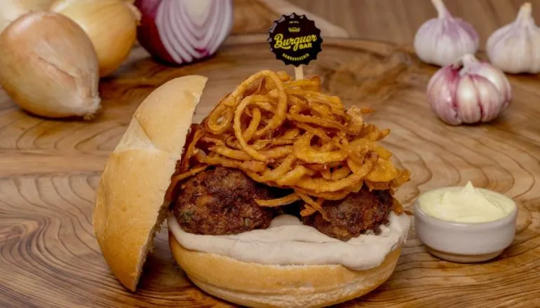 Descrição: Três de bolinho de carne bovina, maionese especial de alho negro, cebola crocante artesanal, servido no pão d’água. Acompanha maionese Burguer Bar.