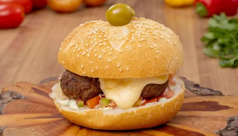 Descrição: Bolinho de carne bovina, maionese especial da casa, queijo muçarela e vinagrete de mimosa, servido no pão d’água.