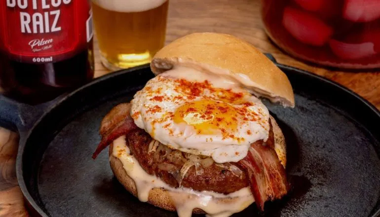 Descrição: Pão d´agua crocante, bolinho de carne bovina temperado, queijo muçarela derretido, aioli, fatia de bacon crocante, ovo caipira com gema mole e páprica picante.