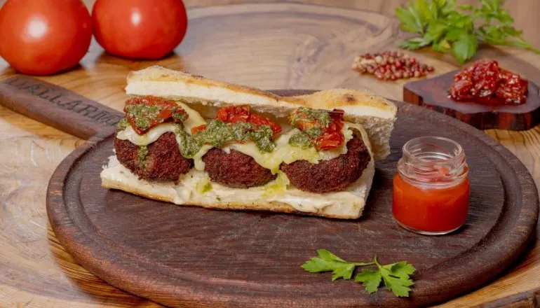 Descrição: Pão com Bolinho Siciliano – três unidades de bolinho de carne, maionese artesanal de pimenta rosa, queijo muçarela derretido, tomate seco artesanal, molho pesto de salsinha da casa, servido no panuozzo de fermentação natural.