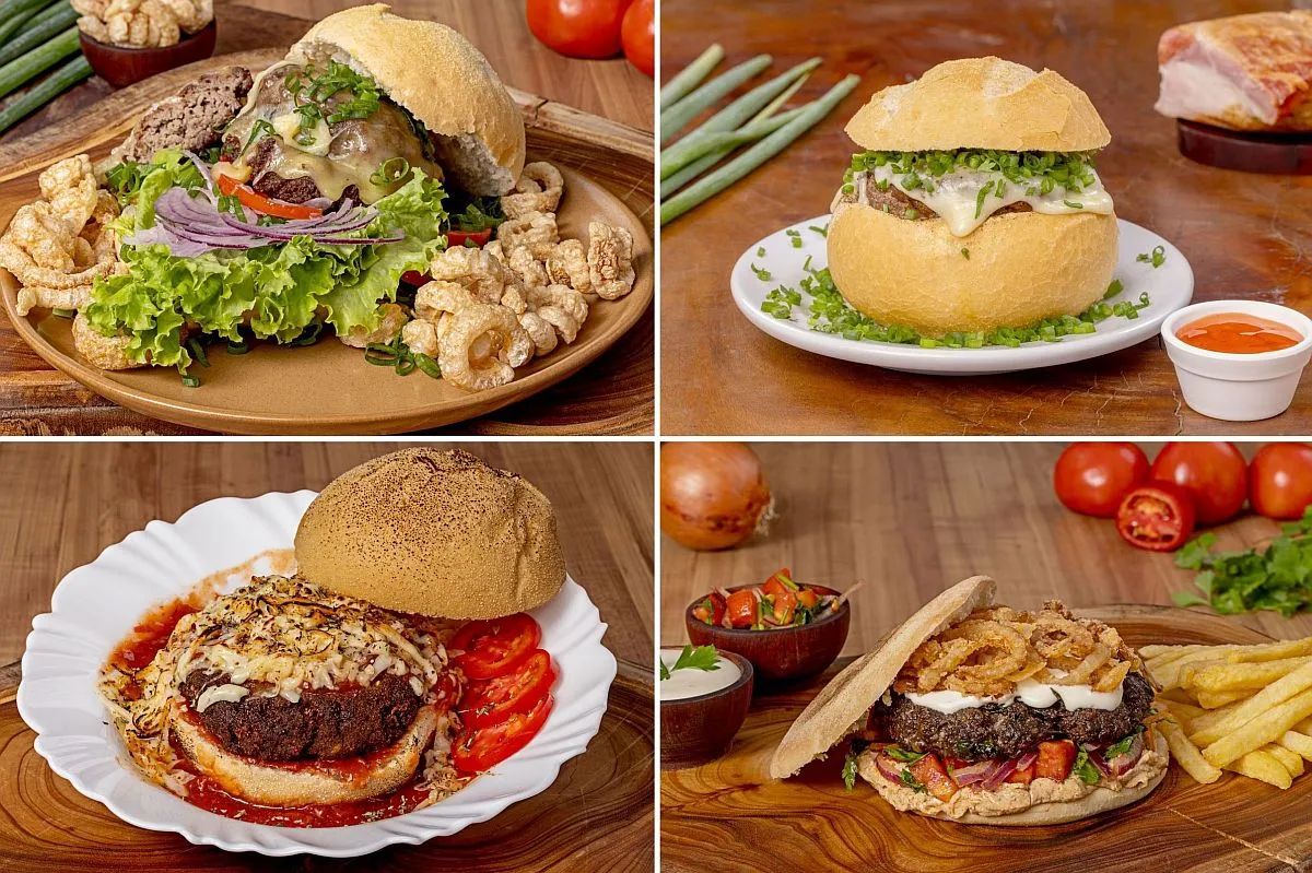 Os acompanhamentos incluem bacon, geleia de pimenta, queijos dos mais diversos, saladas, cebola crispy, maioneses diferentes e molhos para todos os gostos.
