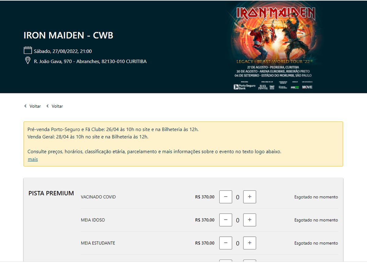 Durou pouco mais de uma semana a venda de ingressos para o show da banda de heavy metal Iron Maiden, programado para agosto, em Curitiba. Nesta quinta-feira todos os bilhetes disponíveis, para pista premium, pista e camarote, esgotaram. Pelo menos segundo o site Live Pass, portal de vendas de ingressos oficial.
