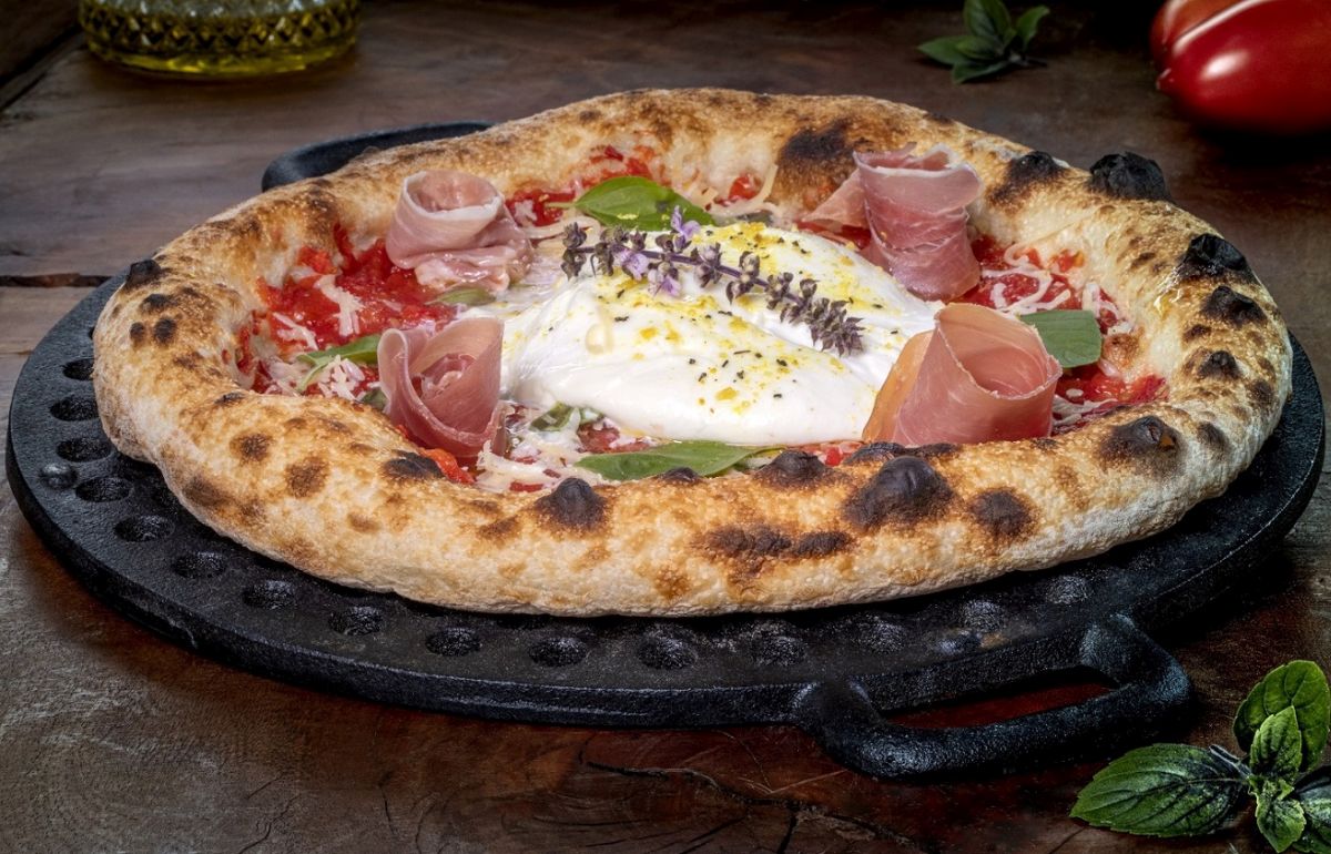 1- Armazém Colônia – Burrata com Parma: pizza napolitana clássica com massa de longa fermentação natural (au levain), molho caseiro de tomate, muçarela, burrata de búfala, presunto Parma e folhas frescas de manjericão.