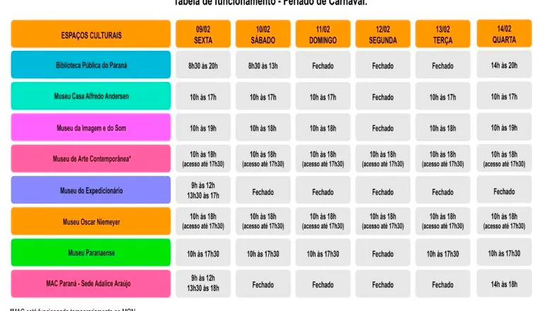 Os espaços culturais mantidos pelo estado e localizados em Curitiba funcionarão com uma programação especial durante o feriado de Carnaval. Os museus abrem em diferentes horários nos dias 10, 11, 13 e 14 de fevereiro. Na segunda-feira (12), as instituições estarão fechadas, exceto o Museu Oscar Niemeyer (MON) e o Museu de Arte Contemporânea do Paraná (MAC-PR).