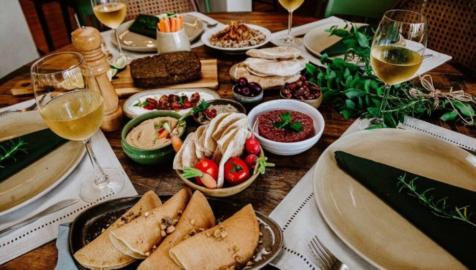 A chef Vaneska Berçani montou uma opção de almoço que serve até 4 pessoas (foto) e estará disponível no sábado e domingo, para take away ou delivery. O kit inclui como entradas 4 esfihas de carne, 4 quibes fritos pequenos, 4 bolinhos de falafel, pastas (coalhada seca, homus, baba ganoush), pães sírios e torradas. Para o prato principal: salada fatuche, arroz com lentilhas e cebolas fritas e bandeja de quibe assado com nozes. Acompanha ainda ninhos diversos de doces árabes. O valor é R$ 220 e as encomendas podem ser feitas pelo WhatsApp (41) 99209-4936. Para quem preferir, o salão do restaurante também estará aberto com o cardápio completo.